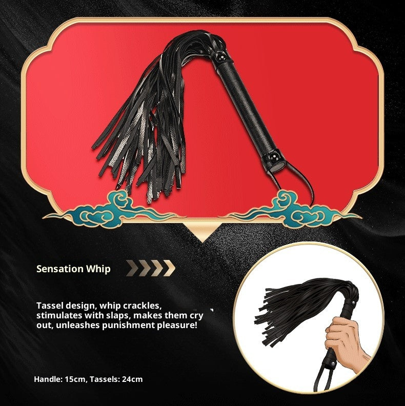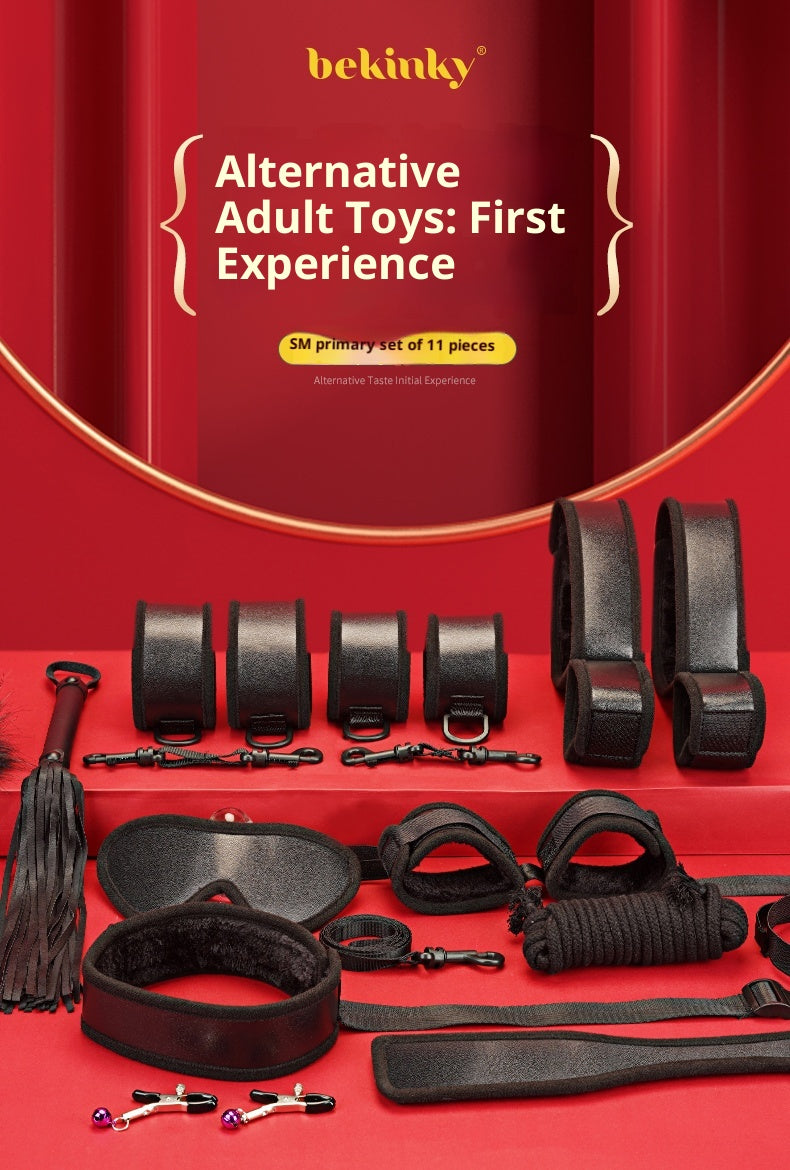 11-Piece All-in-One Set – Includes cuffs, blindfold, collar, leash, rope, paddle, whip, feather tickler, gag, and nipple clamps.
